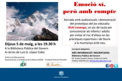 Xerrada amb audiovisuals i demostració d'un joc educatiu creat per Luís G. López Cobo. Tot en relació als perills de les allaus en les pràctiques esportives i de lleure en la muntanya amb neu.
