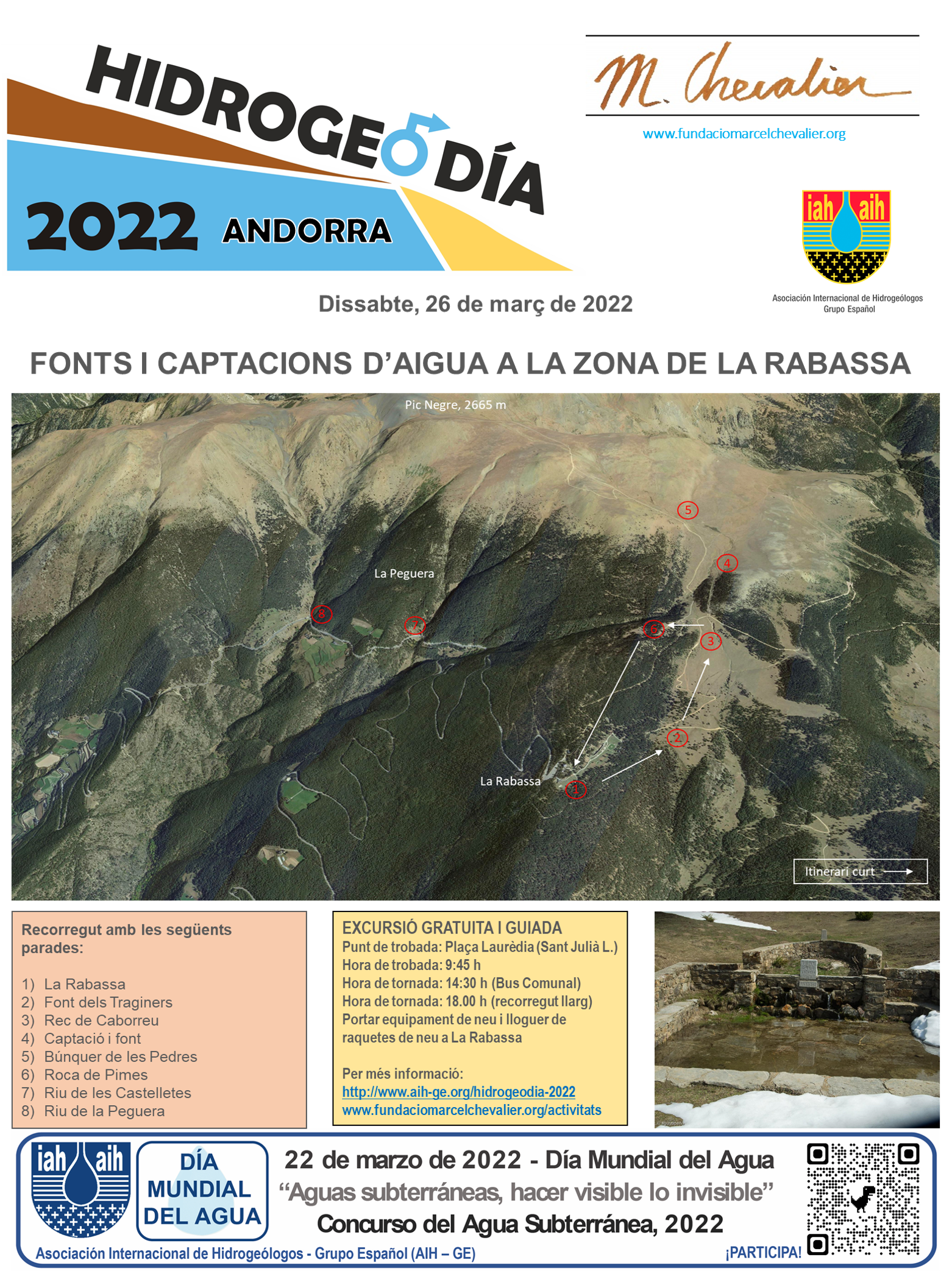 L'excursió que enguany organitza la Fundació Marcel Chevalier (FMC) com a activitat del dia Mundial de l'Aigua - Hidrogeodia a Andorra (aquest any dedicat a les aigües subterrànies) porta per títol FONTS I CAPTACIONS D'AIGUA A LA ZONA DE LA RABASSA (vegeu informació i la ruta prevista als documents adjunts).
